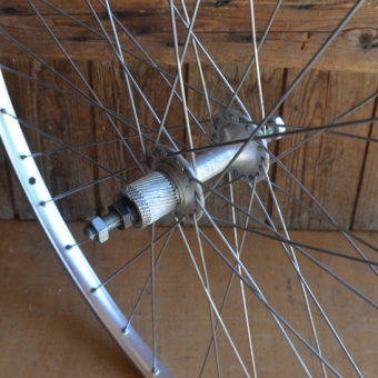 Laufrad 28 x 1 1/8 (622x18) hinten, Alufelge "Schürmann" 80er Jahre, Breite 22 mm, Nabe Maillard Helicomatic, Einbaumaß 125 mm