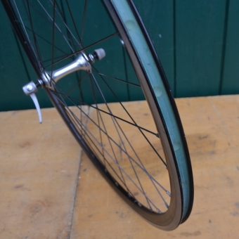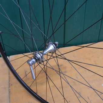 Laufrad vorn 28 Zoll mit Felge für Drahtbereifung "Rigida DP 18", 622-13, Breite 18,5 mm, Speichen schwarz, Einbaumaß 100 mm, Nabe "Shimano Ultrega" Ventilbohrung 6,3 mm, 32-Loch