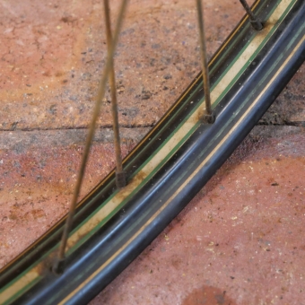 Hinterrad 28 x 1,75/2,00 (Bj. 51), Torpedo-Nabe, linierung blau/weiß, Breite 36 mm, Einbaumaß 110 mm, gebraucht mit Patina