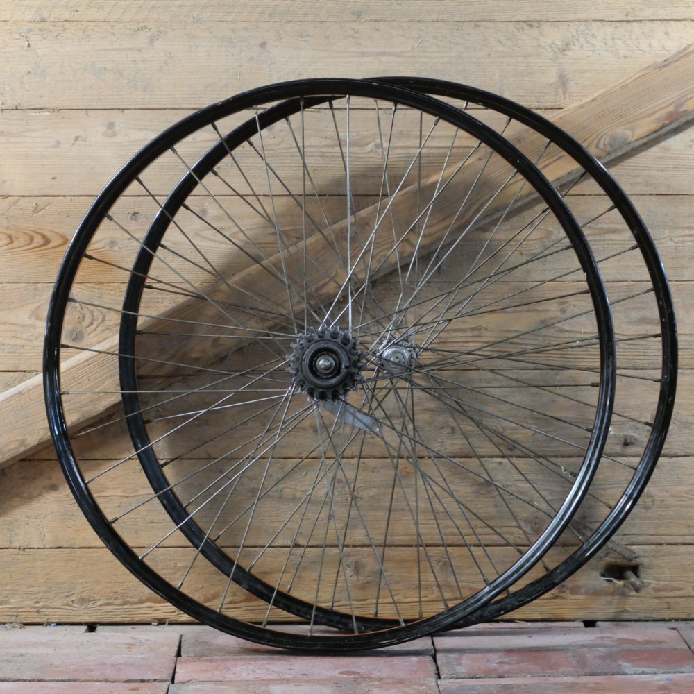 Laufradsatz, 26 Zoll (559), 1951, Felgen schwarz, Mitte Holzdekor, Linien weiß/gold, Breite ca.