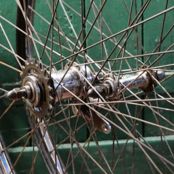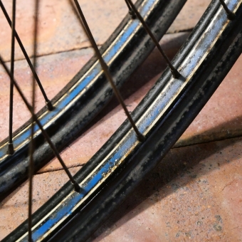 blau/weiß, Breite ca. 37mm, Speichen 2mm verchromt, Naben: vorn "Wecona" verchromt, hinten "F&S Torpedo" mit Schraubritzel