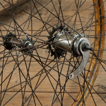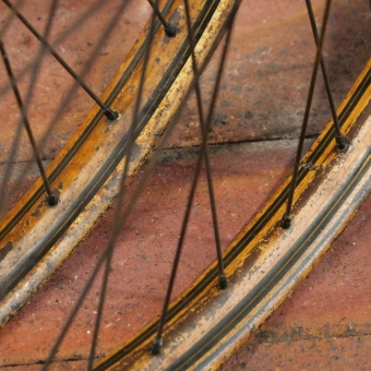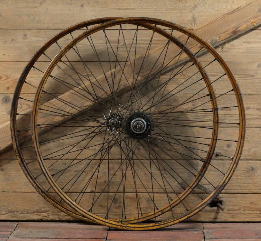Laufradsatz 26 Zoll (559) für Drahtbereifung Ballonrad, 1934, Westwood-Form, Felgenbreite ca. 40 mm, Holzdekor,