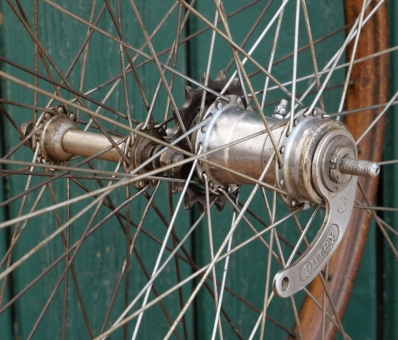 5/8 Zoll Schraubritzel 16 Zähne, Speichen hinten 2 mm verchromt, vorn vernickelt, gebraucht mit