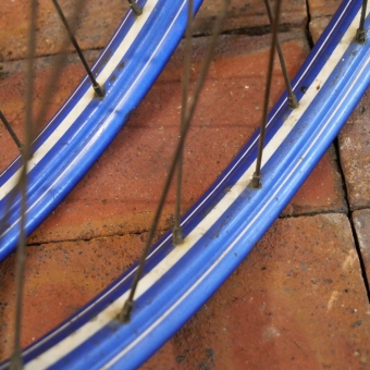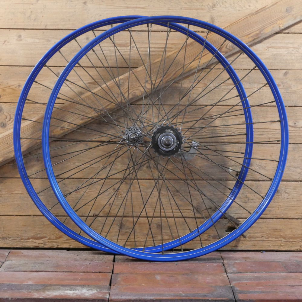 Laufradsatz 26 Zoll (559) für Drahtbereifung, original 1953, Felgenbreite ca. 35 mm, blau, Linierung weiß,