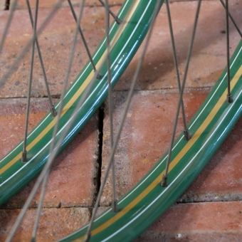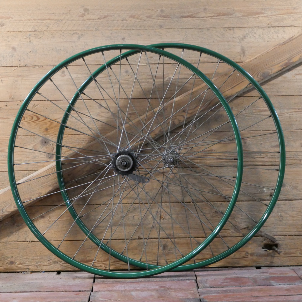 Laufradsatz, 26 Zoll, Außendurchmesser ca. 581 mm, 1920er/30er J., für Wulstbereifung, grün, Linien gold/weiß, Breite