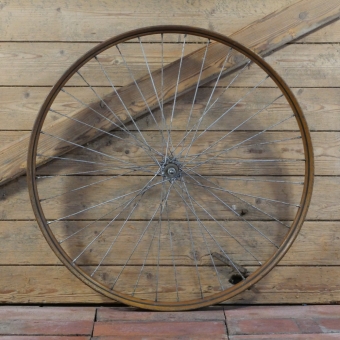 Vorderrad 26 Zoll (559) für Ballonbereifung, 30er J., Holzdekor, Linien schwarz, Breite ca. 38mm, Nabe verchromt, Einbaumaß: ca. 88mm, 2mm Speichen verchromt, gebraucht mit schöner Patina, Lager o.k., Zustand gemäß Fotos
