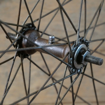 Vorderrad für Drahtbereifung 26 Zoll (559), passend für Ballonrad, 1930er J., Felge Holzdekor, Nabe verchromt, gebr.