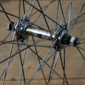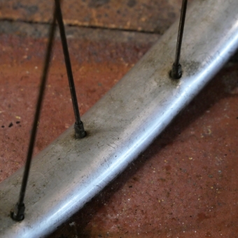 Vorderrad für Wulstbereifung 26 Zoll (571), 30er J., Felge Alu, Breite 32 mm, Nabe verchromt, Einbaumaß ca. 96 mm, 2mm Chrom-Speichen, gebraucht mit Patina, Zustand gemäß Fotos