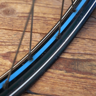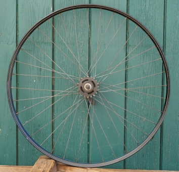 Hinterrad 28 Zoll (622), für Drahtbereifung, Bj. 1943, WW2, schwarz, Linien blau/weiß, Breite ca. 36mm, F&S