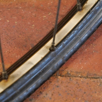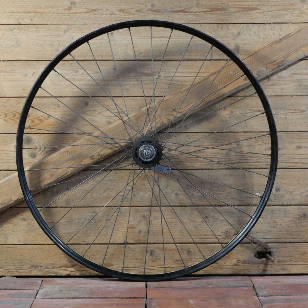 Hinterrad 28 Zoll (622) für Drahtbereifung, Bj. 1950, schwarz, Linien weiß geflammt/gold, Breite ca. 36mm,