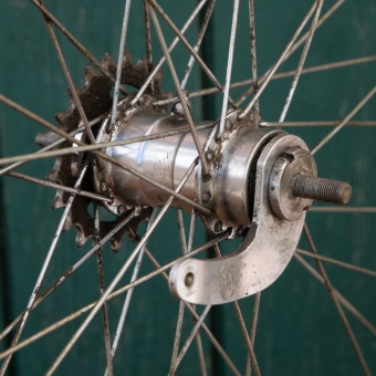 Hinterrad 28 Zoll (622) für Drahtbereifung, original 50er J., lindgrün-metallic, Linien gold/weiß, Breite ca.