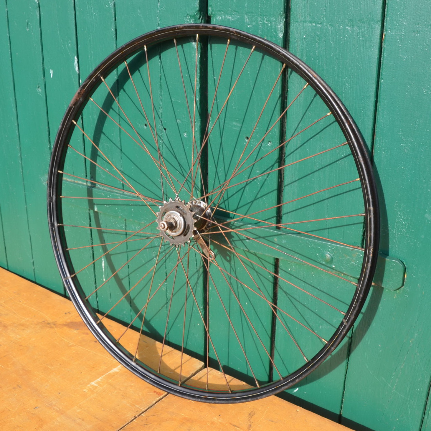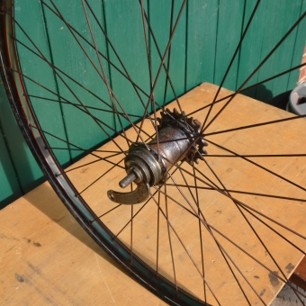 Hinterrad 28 x 1,75/2,00 Stahl, Schwarz, Linierung grün/rot/weiß, mit Patina, Sachs Torpedo Nabe von 1938, Breite 38 mm, Einbaumaß 108 mm, Ventilbohrung 8,5 mm