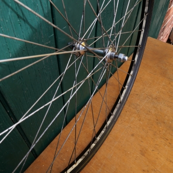 Laufrad 28 x 1,75 Vorderrad, Breite 36 mm, schwarz, Linierung weiß geflammt/gold, Einbaumaß 90 mm, 50er Jahre