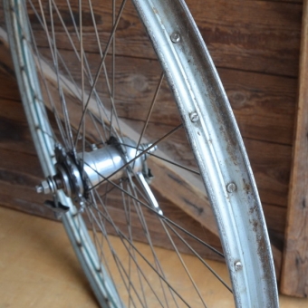 Laufrad 28 x 1,75, silber, grün liniert, Torpedo-Nabe 1954, orig. Altbestand mit Patina