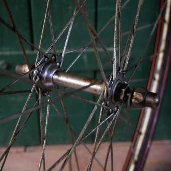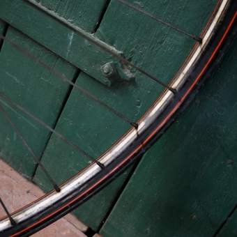 Laufrad vorn 28 x 1,75 für Drahtbereifung, schwarz, Linierung gold/weiss/rot, 1950er-60er J.