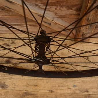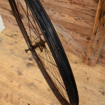 Laufrad vorn, Felge für Wulstbereifung mit kräftiger Patina, Nabe mit Helmöler 28 x 1 ½, Speichen verzinkt und rostig. Einbaumaß 82 mm, Gebraucht mit Patina, siehe Bilder