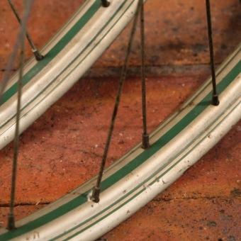 Laufradsatz 28 Zoll (622) für Drahtbereifung, 50er Jahre, Felgenbreite ca. 35 mm, silber, Linierung grün,