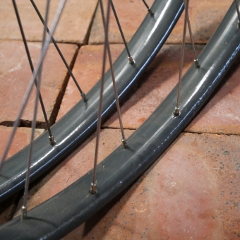 Laufradsatz 28 Zoll, Außenmaß ca. 645 mm, für Wulstbereifung, restauriert, Felgen fliegergrau, Breite 33 mm,