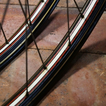 Laufradsatz 28 x 1,75 (622) für Drahtbereifung, um 1960, Felgenbreite ca. 35 mm, schwarz, Linierung