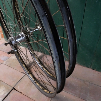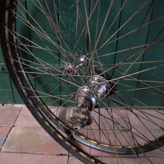 Laufradsatz 28 x 1,75, "Miele" schwarz, 50er Jahre, Linierung gold geflammt, Hinterradnabe "Sachs Torpedo Modell 53", Vorderradnabe "Miele", Speichen verzinkt, Felgenbreite 36 mm, mit Nabenschloß, Einbaumaß 90/110 mm