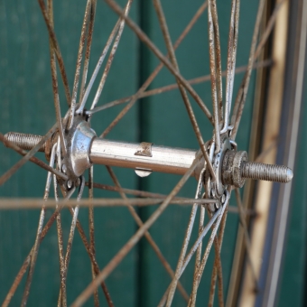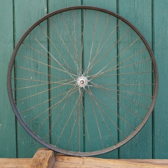 Vorderrad 28 Zoll (622), für Drahtbereifung, 1950er/60er J., schwarz, Linien gold/weiß, Nabe verchromt, gebr.