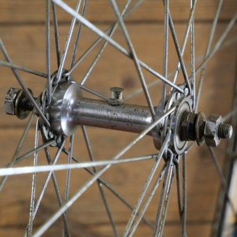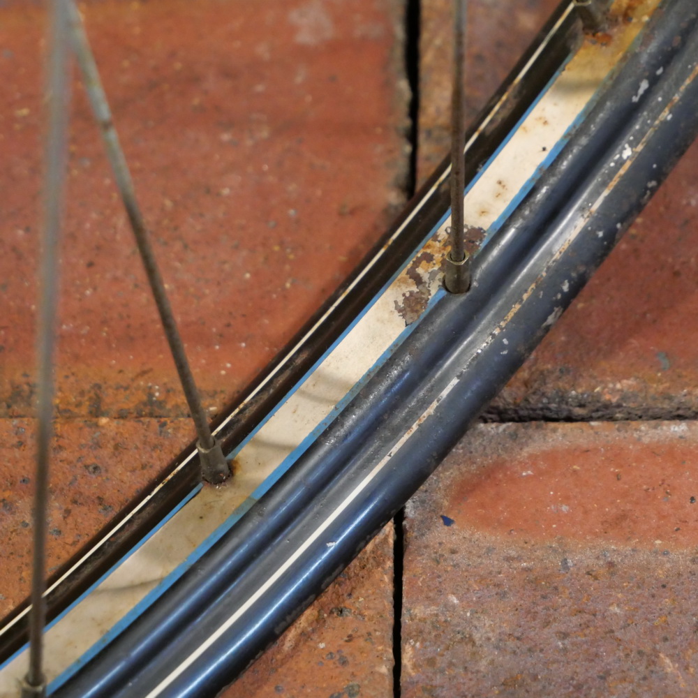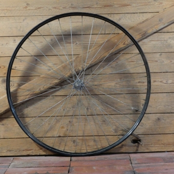 Vorderrad 28 Zoll (622) für Drahtbereifung, 30er-50er J., schwarz, Linien weiß geflammt/blau/weiß, Breite ca. 36mm, UNION-Nabe, verchromt, Einbaumaß: ca. 91mm, 2mm Speichen verchromt, gebraucht mit Patina, Lager gut, Zustand gemäß Fotos