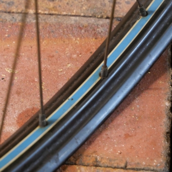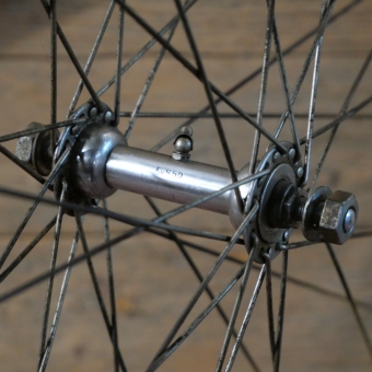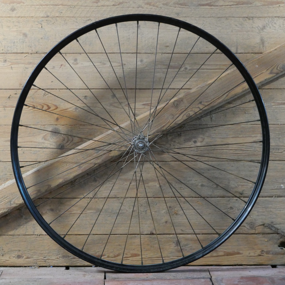 Vorderrad für Drahtbereifung 28 Zoll (622), DDR 1950, Felge schwarz, Linien blau/weiß, Breite ca. 38 mm, F&S-Nabe (Reichenbach) verchromt, Einbaumaß ca. 91 mm, 36 Loch, 2mm Nickel-Speichen, gebraucht mit schöner Patina, Zustand gemäß Fotos