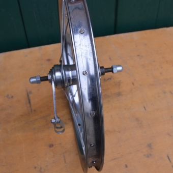 Laufrad hinten 18 Zoll, 18 x 1,75 von "Ruhrwerk", Nabe "Favorit" Ventilbohrung 8,5 mm, Breite 28 mm, Einbaumaß 108 mm, Felge verchromt, Speichen verzinkt, 20-Loch, NOS