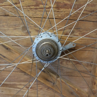 Laufrad hinten 24 Zoll, (559-19C) Alufelge, Breite 25 mm, "Sachs Spectro S7-Nabe", Speichen rostfrei, Neu mit Patina, Einbaumaß 130 mm, mit Anbauteilen für Nabe, ohne Schaltgriff