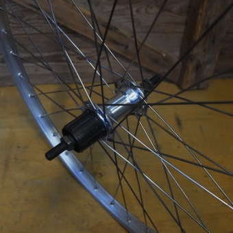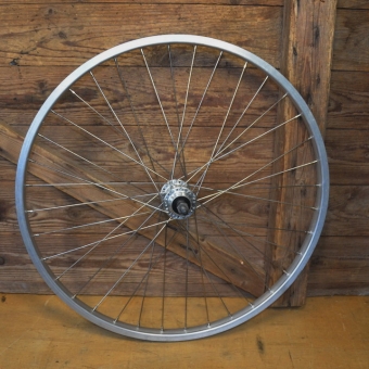 Laufrad hinten 24 Zoll, "Grünert" Alufelge (507-19C), Speichen rostfrei 36-Loch, Ventilohrung, 8,5 mm, Breite 25mm, Einbaumaß 136 mm, NOS mit leichter Patina