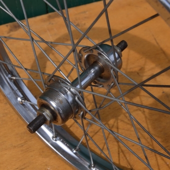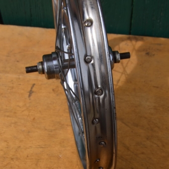 Laufrad hinten "Raleigh" 16 x 1,75 verchromt, Breite 33 mm, Einbaumaß 115 mm, Ventilbohrung 8,5 mm, Speichen verzinkt, etwas Patina, alte Neuware