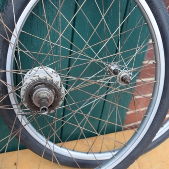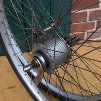 Laufradsatz 26 Zoll bereift. Alu-Felgen, Breite 30 mm, Bereifung 26 x 1,75 "Kenda", Sachs-Torpedo 3-Gang Nabe Modell 53 Alu (Dicke Berta), Mit Oberrohr-Schalthebel und Gestänge, Einbaumaß ca. 90/115