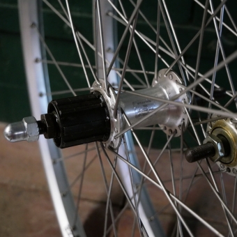 Alu mit Vollachse, Nabe hinten SHIMANO mit Vollachse für 7-fach Kassette, Einbaumaß ca. 100/130 mm, 2mm Speichen