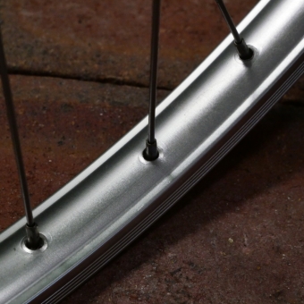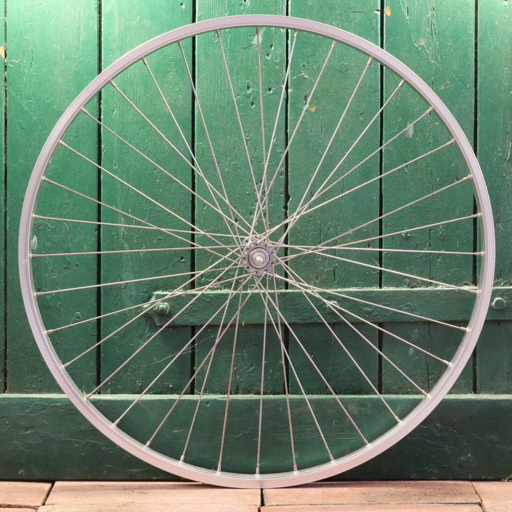 Vorderrad, 26 Zoll (559), Alu, Kastenfelge für Drahtreifen, Breite ca. 27 mm, Nabe Stahl, verchromt,