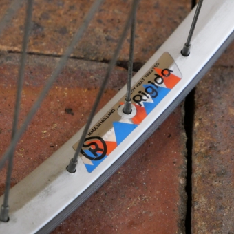 Vorderrad mit RIGIDA Alu-Felge 26 Zoll (559), 1990er J., Breite ca. 26 mm, SACHS Alu-Nabe mit 9mm Achse, Einbaumaß ca. 100 mm, 2mm Speichen verzinkt, gebraucht mit Patina, Zustand gemäß Fotos