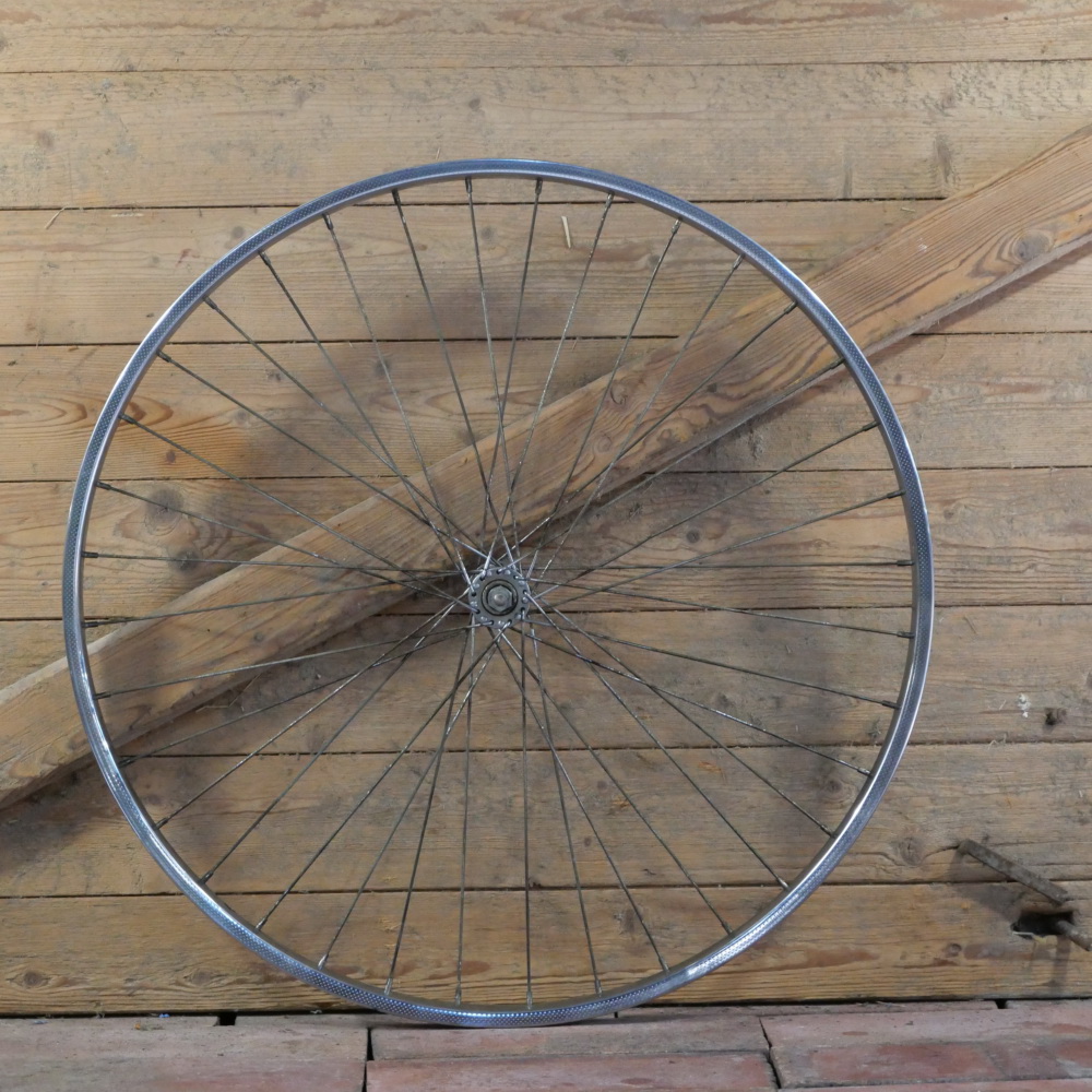 Vorderrad mit Regida-Felge 26 Zoll (559), verchromt, 1970er/80er J., Breite 28 mm, KB-Nabe verchromt, Einbaumaß ca. 91 mm, 2mm Speichen verchromt, gebraucht mit Patina, Zustand gemäß Fotos