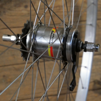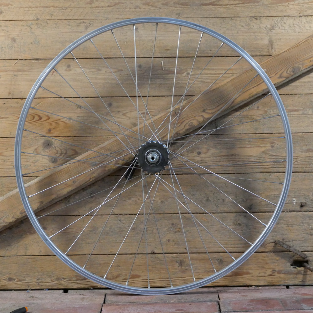 mit Steckritzel 19 Zähne, Einbaumaß ca. 118 mm, 36 Loch, 2 mm Speichen nirosta, alte Neuware,