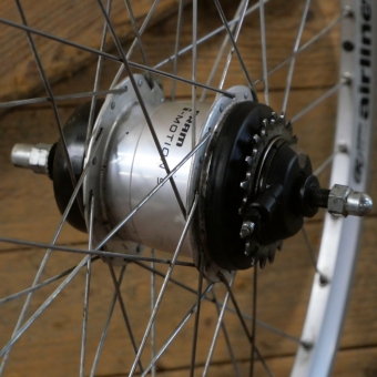 Hinterrad mit RODI Airline-Felge, Alu, Hohlkammer, 26 Zoll (559), Breite ca. 25 mm, Nabe SRAM I-Motion 9-Gang mit Steckritzel 19 Zähne, Einbaumaß ca. 135 mm, 36 Loch, 2 mm Speichen nirosta, leicht gebraucht, Zustand gemäß Fotos
