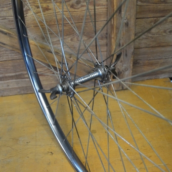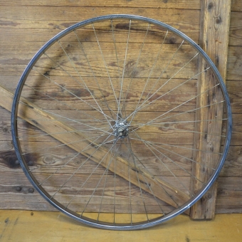 Laufrad vorn 28 x 1 ¼ x 1 ¾ (622-22) für Drahtbereifung, verchromt, Speichen verzinkt mit Patina, Ventilbohrung 8,5 mm, 36-Loch, Breite 29 mm, Einbaumaß 90 mm.