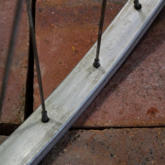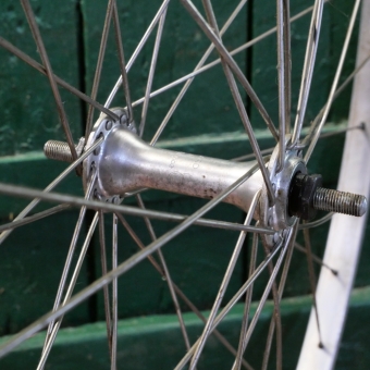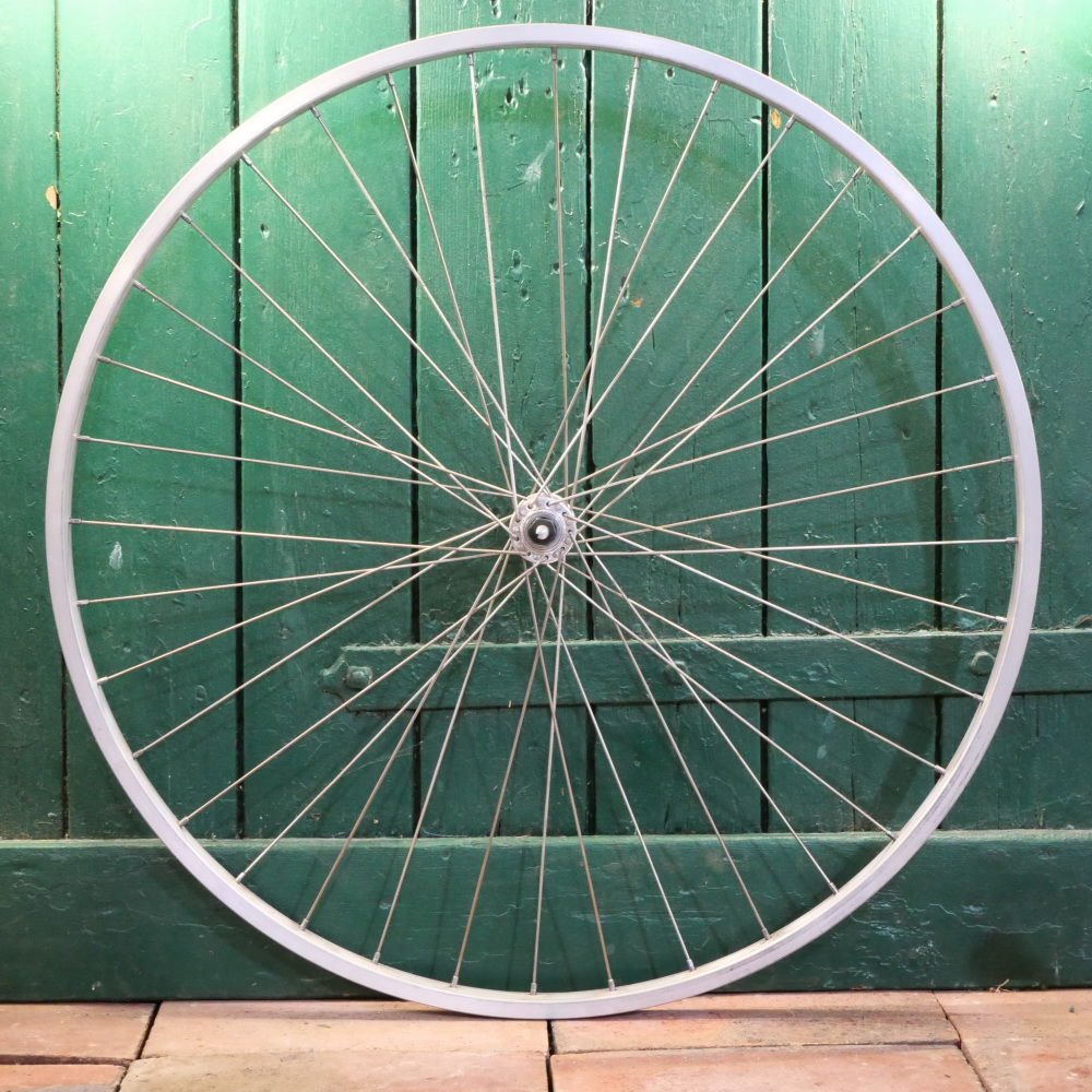 Vorderrad "RW", 28 Zoll (622), Alu, Kastenfelge für Drahtreifen, original 1980er Jahre, Breite ca. 24 mm, Nabe "Maillard", Alu, Vollachse, Einbaumaß ca. 96 mm, 2 mm Speichen rostfrei, alte Neuware mit Lagerungsspuren gemäß Fotos