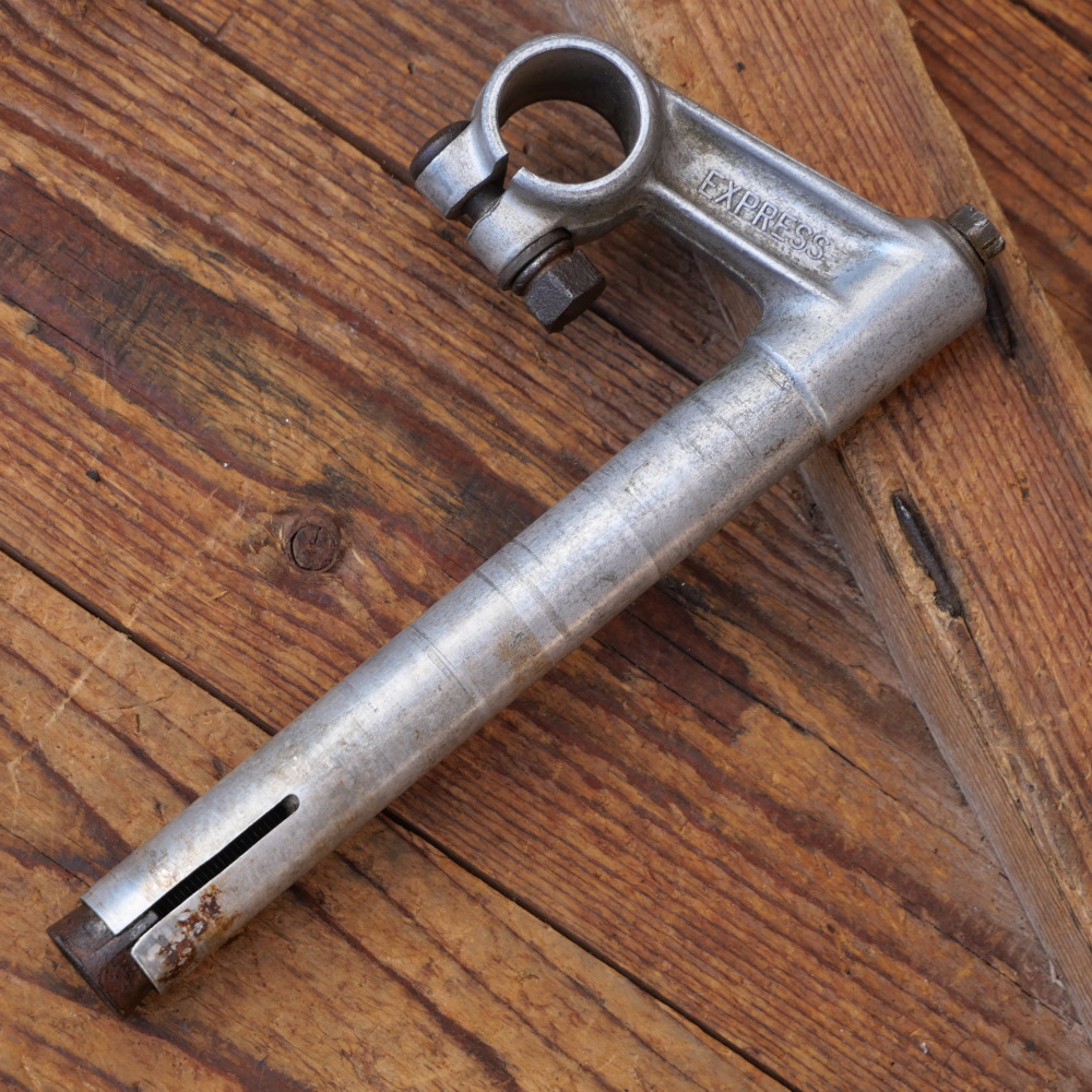 Vorbau Fahrrad EXPRESS, original 50er Jahre, für Sport-/Rennrad, Alu, Länge 75 mm, Schafthöhe ca. 150 mm, Durchmesser Klemmung 25 mm, gebraucht mit Patina, Zustand gemäß Fotos.