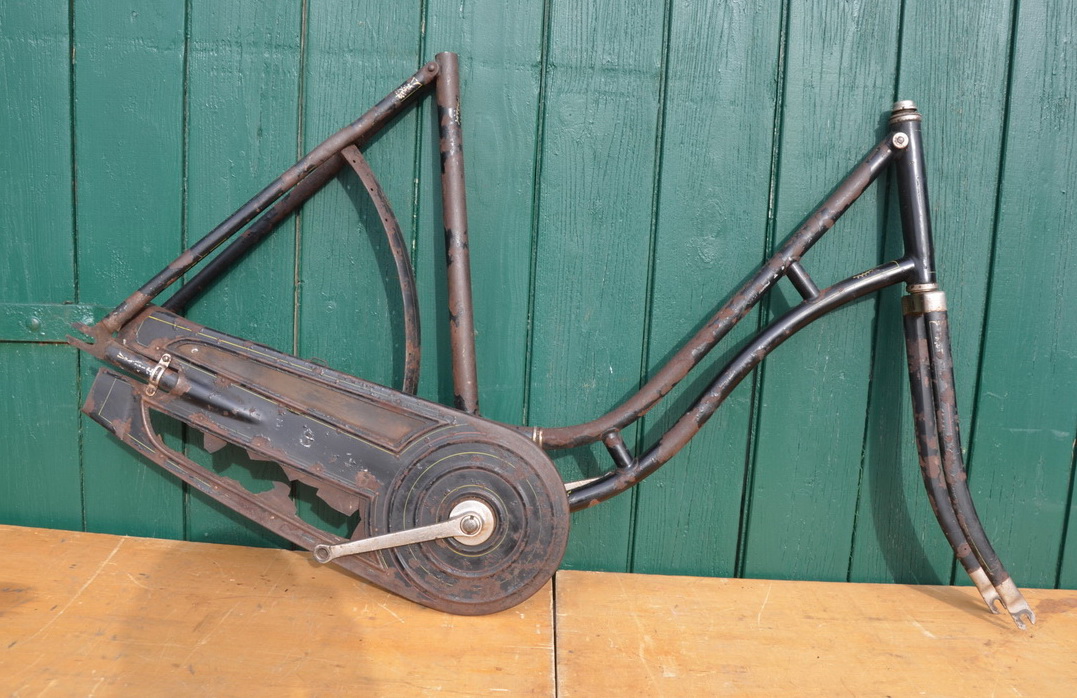 Fahrradrahmen Damenausführung 28 Zoll, 10er Jahre, mit Zelluloid-Kettenkasten, Rahmenhöhe 55 cm, Rahmennummer 307XXX, 5/8 Zoll Tretlager, guter Zustand