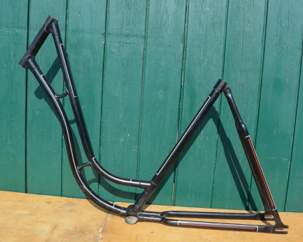 Dieser Rahmen wurde von Jahrzehnten abgestrahlt, neu lackiert, handliniert aber nie aufgebaut. Ein paar lagerungsbedingte, kleine Kratzer können vorhanden sein. Ansonsten aber eine unschlagbar günstige Möglichkeit, einen bereits aufgearbeiteten, frühen Rahmen zu neuem Leben zu erwecken!