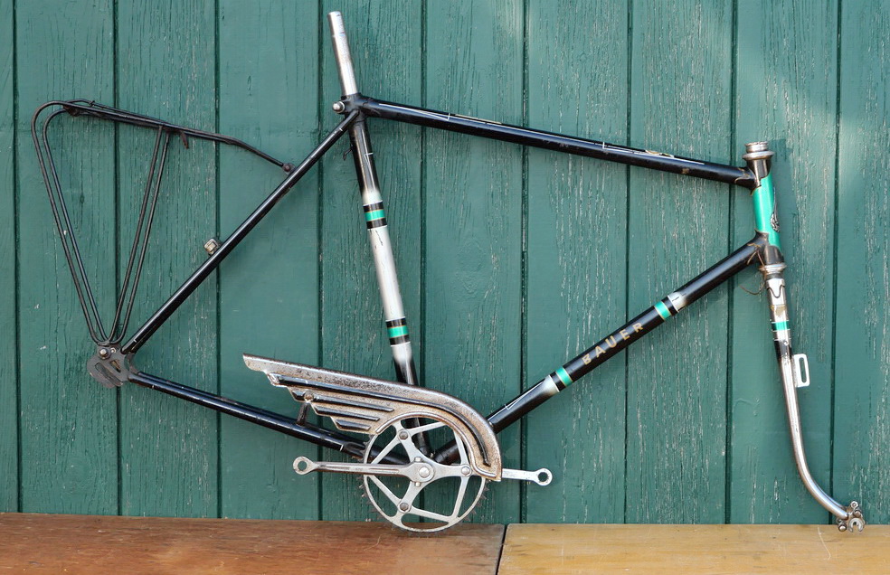 Rahmennummer 2182XXX, Einbaumaß 112 mm, BSA-Keillager, Kettenblatt 47 Zähne, Kurbeln BAUER gemarkt, inkl. Träger