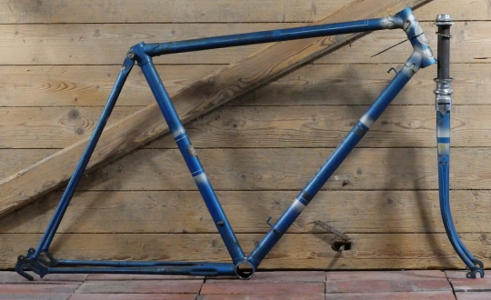 Fahrradrahmen SFW, Herrenausführung für Sportrad, 26 Zoll, 1950er Jahre, blau-metallic/silber, Linien weiß, gebr.
