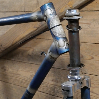 Fahrradrahmen SFW, Herrenausführung für Sportrad, 26 Zoll, 1950er Jahre, blau-metallic/silber, Linien weiß, Rahmenhöhe 53 cm, Einbaumaß ca. 114 mm, Rahmennummer 857XXX, für BSA-Lager, gebraucht mit Patina, Steuersatz demontiert, Zustand gemäß Fotos