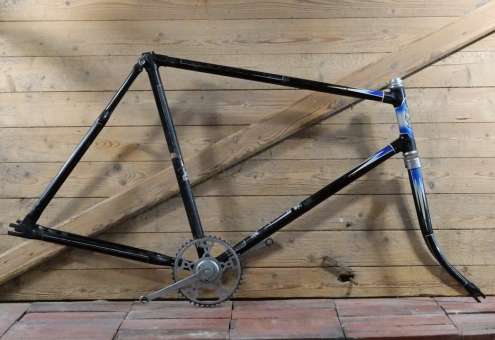 Fahrradrahmen TURNIER/GÖRICKE, Herrenausführung, 26 Zoll, 1950er Jahre, schwarz, Strahlenkopf blau/weiß, Linien