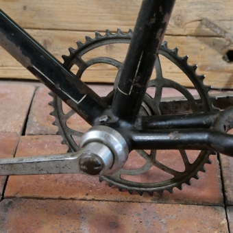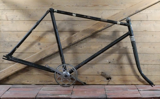 Fahrradrahmen IMPERIAL, Herrenausführung, muffenlos, 26 Zoll, 1930er Jahre, schwarz, Linien gelb/blau, Rahmenhöhe 56 cm, Einbaumaß ca. 116 mm, Rahmennummer 537XXX, Glockenlager mit Kettenblatt 48 Zähne, gebraucht mit Patina, Zustand gemäß Fotos