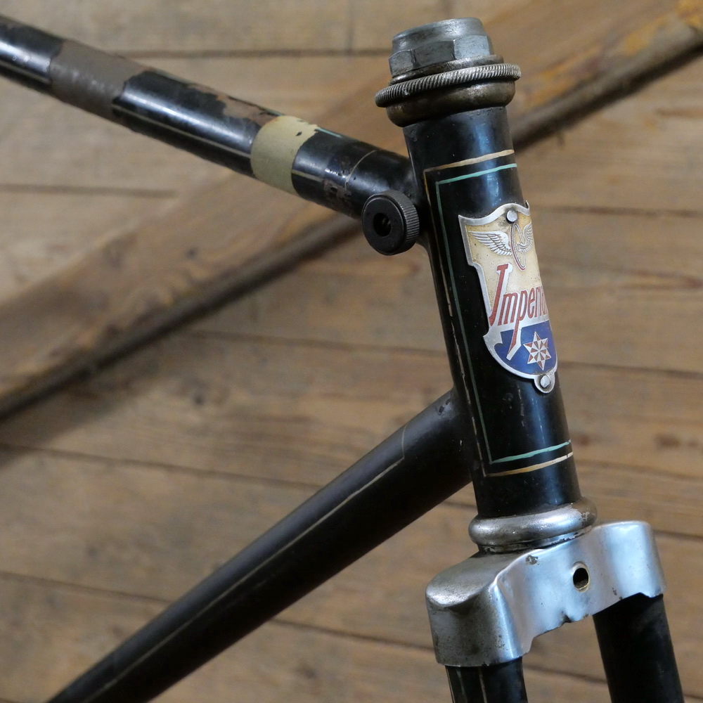 Fahrradrahmen IMPERIAL, Herrenausführung, muffenlos, 26 Zoll, 1930er Jahre, schwarz, Linien gelb/blau, gebr.