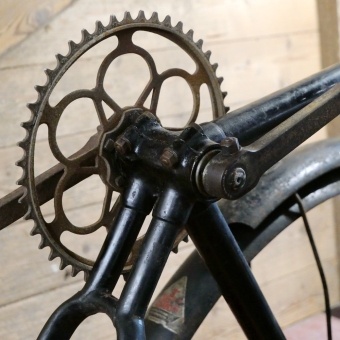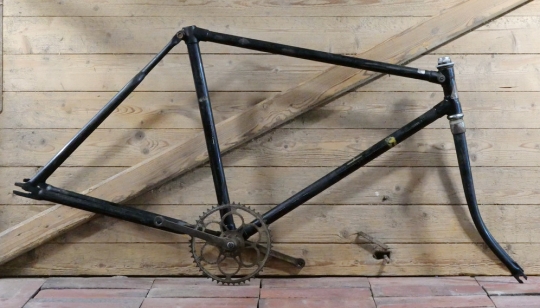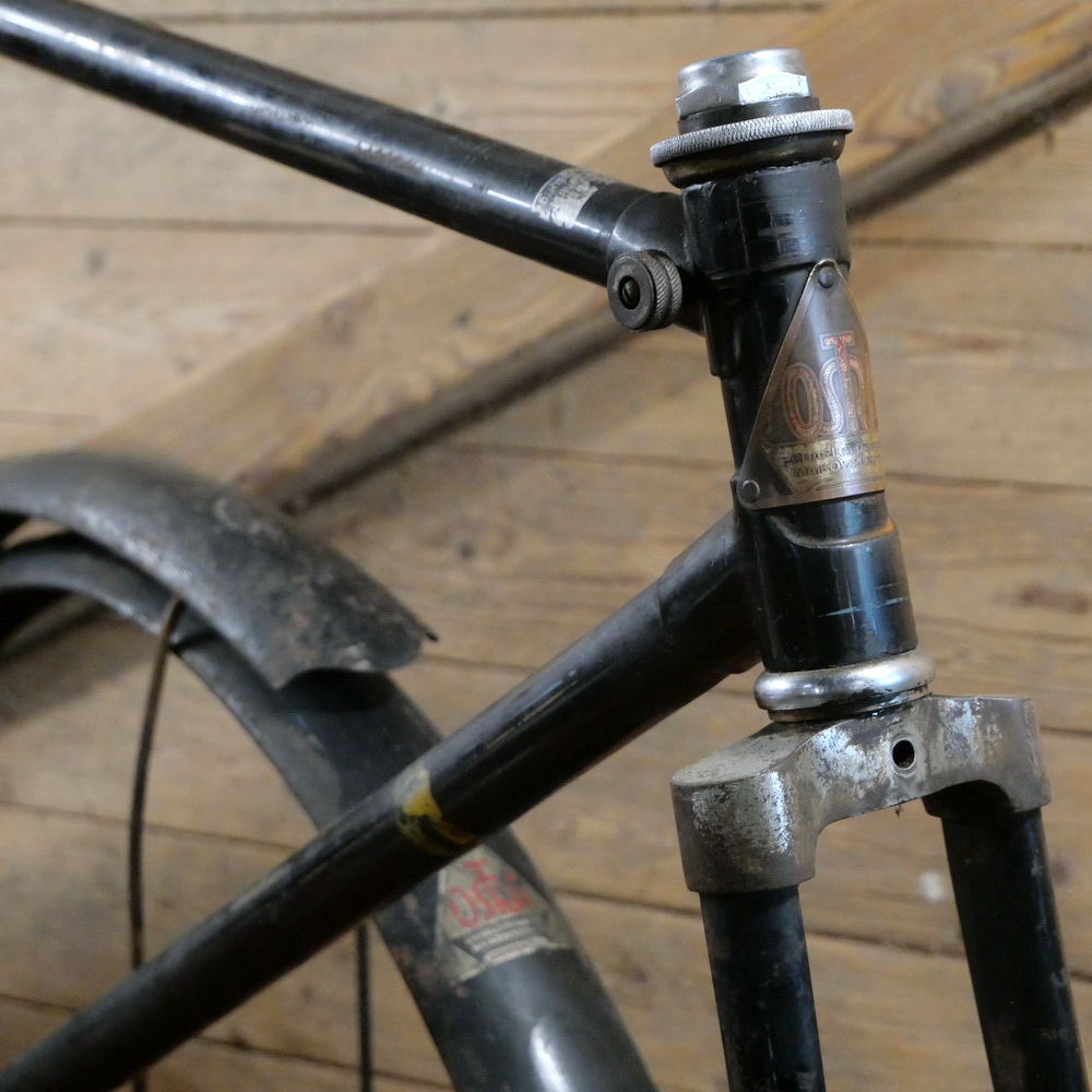 Fahrradrahmen OSTRA/Berlin, Herrenausführung für Ballonrad, 26 Zoll, 1930er Jahre, schwarz, Linien gold/blau, Rahmenhöhe 52 cm, Einbaumaß ca. 110 mm, Rahmennummer 257XXX, hochwertiges Schraublager mit Kettenblatt 48 Zähne, inkl. original Schutzbleche,
